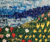 mother-of-pearl, quartz, river rock, rose quartz, turquoise, and yellow agate.